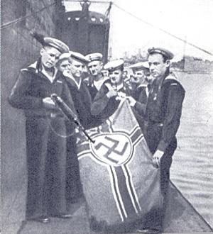 Marynarze "S-33", wchodzącego w skład Floty Czarnomorskiej, prezentują na pokładzie swojej jednostki zdobyczną hitlerowską banderę. Fotografia z V.I.Dmitriev "Atakuyut podwodniki", Moskwa, 1973.